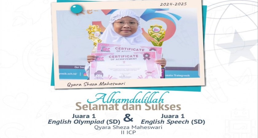 Kak Qyara Sheza Maheswari 2 ICP, Juara 1 English Olympiad SD dan English Speech SD pada Gebyar Prestasi Gresik 2024 Gresik English Center Tingkat Kabupaten